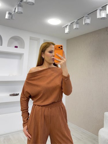 • Kadın uzun kollu omuz dekolteli bluz ve palazzo pantolon ikili takım